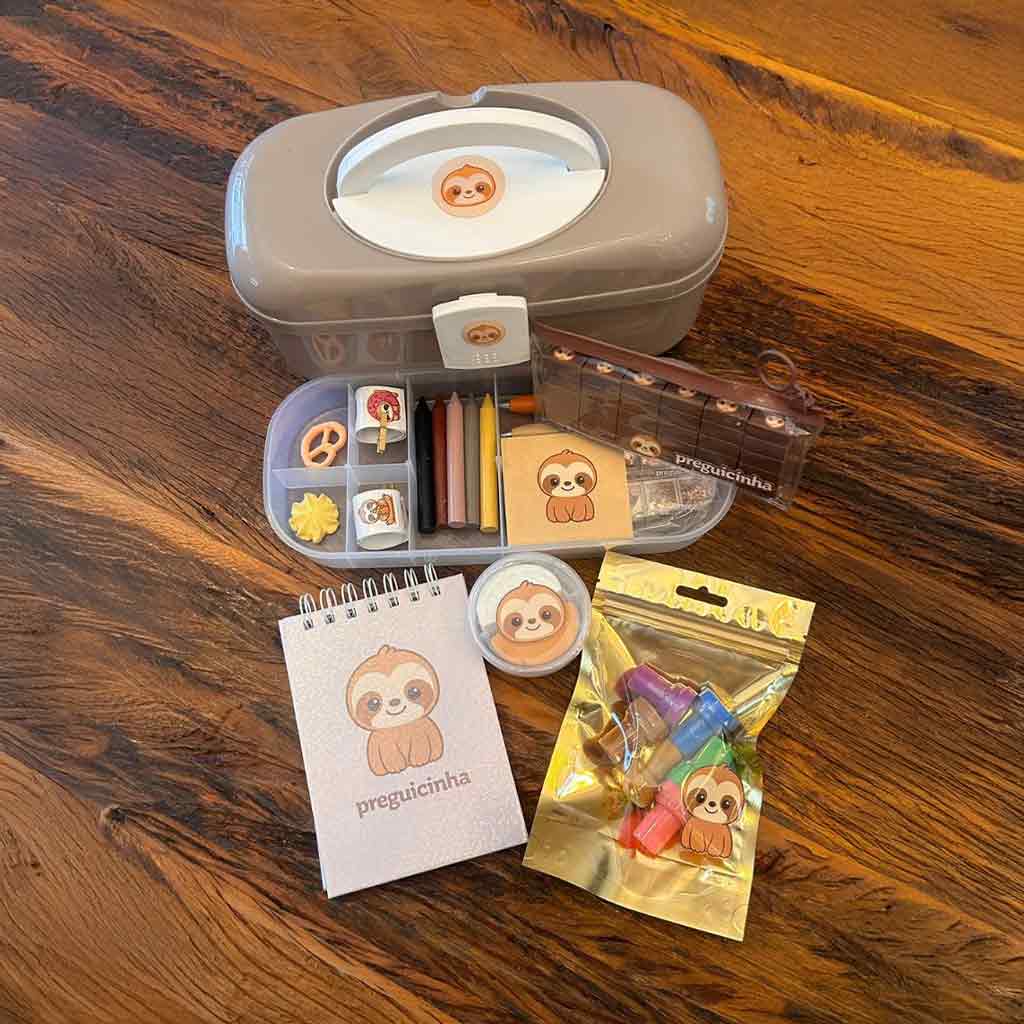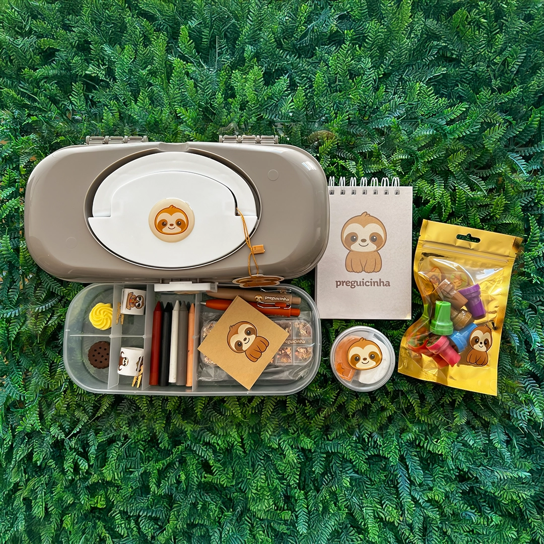 Um convite à imaginação. O Kit Criativo Preguicinha Arte vem com maleta, marca-texto, bloco, adesivos, borrachas, carimbos, bloco wire-o, massinha, glitter e giz de cera. Ideal para momentos de diversão e criatividade.